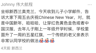 “坐标新西兰奥克兰,今天收到儿子小学邮件,告诉大家下周五去庆祝Chinese New Year,对,就是中国新年,哈哈哈,让穿红色黄色金色或者中国汉服,去年儿子刚上一年级开学时候,学校里面升了一周的五星红旗,一个传统的老父亲表示非常认同学校的做法。”