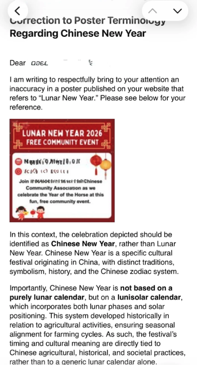 她是给当地社区发了一封邮件,普及Chinese New Year的叫法。