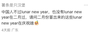 “中国人不过lunar new year,也没有lunar new year在二月过,请问二月份冒出来的这些lunar new year在庆祝啥。”
