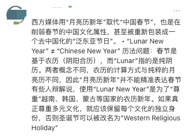 “有些人辩解说,使用‘Lunar New Year’是为了‘尊重’越南、韩国、蒙古等国家的农历新年。如果真正尊重多元文化,就应该保留每个文化的独立身份,否则圣诞节可以被改名为‘Western Religious Holiday’。”