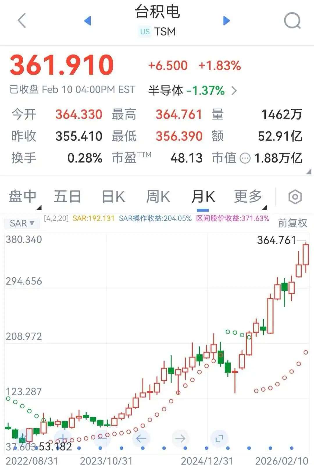 当地时间2月10日,芯片代工巨头台积电美股股价收涨1.83%,报361.91美元,盘中创历史新高。