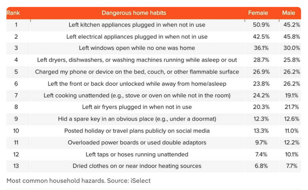 数据还显示,不同人群的危险行为有所不同:25 至 34 岁的成年人最容易出现多种危险家庭习惯,平均每人做过近四种;而老年人(65 岁以上)则相对更谨慎。性别上,女性略更可能忘记拔电器或留窗户开着,而男性则更常出现忘锁门或电源板超负荷的行为。专家强调,虽然保险是保护家园的重要措施,但预防性的日常习惯调整,比如离开前断掉电器电源、及时检查炉灶、锁好门窗,比单靠保险更有效,才能真正降低意外发生的概率。