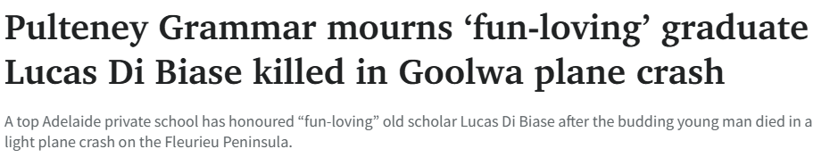 他将被铭记为一个友善、忠诚、热爱生活的年轻人,他的离去让整个Pulteney社区深感痛惜。高中毕业后,Lucas进入University of South Australia攻读航空学位,并即将在新的Adelaide University开学后重返课堂。