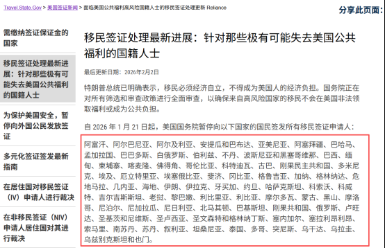 根据官网显示,该政策最后更新时间为2026年2月2日,目前所列的75国名单里,并没有中国。