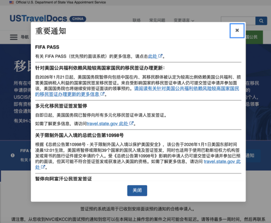 这条乌龙消息源自美国签证预约系统USTravelDocs官网的一个弹窗提示。