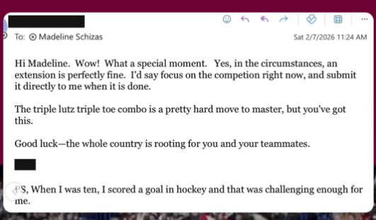近期,一位来自加拿大花样滑冰选手马德琳·施希扎斯(Madeline Schizas)因为一封邮件“一夜爆火”。