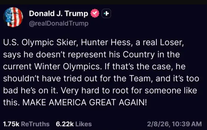 这番话迅速在美国国内引发争议,美国总统唐纳德·特朗普(Donald Trump)随后在社交平台 Truth Social 上公开点名批评赫斯,称他是“真正的失败者(a real loser)”,并表示自己很难支持这样的人。