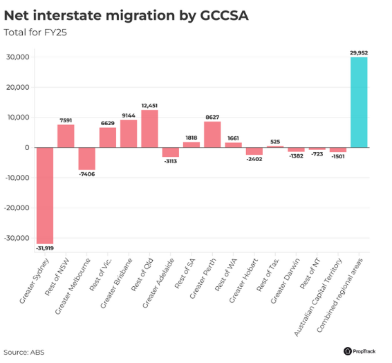 人口流动趋势进一步强化了区域市场的热度。过去二十五年,从首府城市向区域城市的人口迁移持续进行,而近年来远程与混合工作模式的普及,以及首府城市房价高企,加速了这一趋势。在新南威尔士州与维多利亚州,自 2024 年 9 月季度以来,悉尼与墨尔本均出现人口净流出现象,大量居民转向本州其他区域或昆士兰等地的区域中心。这些区域持续呈现人口净流入,推动住房需求由首府城市向区域转移。