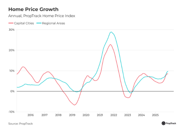 根据 PropTrack 公司发布的 12 月房价指数,全澳房价已创下历史新高,自 2020 年 12 月以来累计上涨近 50%。过去一年,首府城市房价上涨 8.5%,而周边区域房价涨幅更高,达到 9.8%。自 2024 年 8 月以来,区域市场的年增长率一直领先于首府城市,且近期差距进一步扩大,表明这一趋势仍将持续。