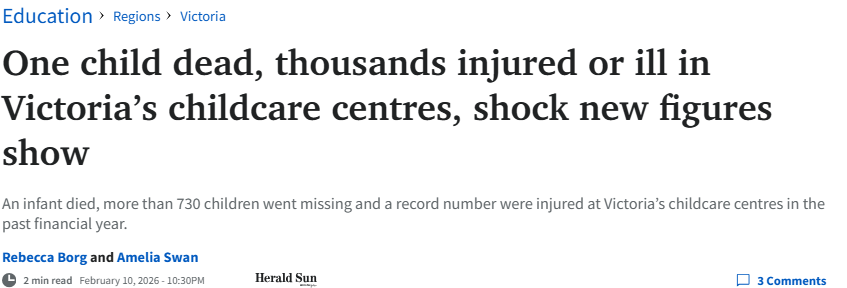 根据Productivity Commission发布的政府服务报告显示,2024-25财年,维州托儿系统里共有6613起严重事故,其中包括1名婴儿死亡、超过730名儿童走失或被带离托管场所,还有5047名孩子在托管期间受伤、生病或遭遇心理创伤。