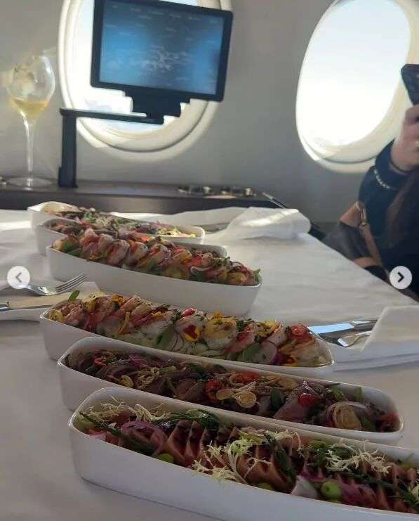 飞机餐是定制纸杯蛋糕、香槟和寿司。