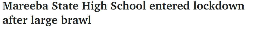 据报道,昆州Mareeba State High School发生了校园暴力事件,学生间的大规模斗殴蔓延至校外街道,学校被迫实施封锁。