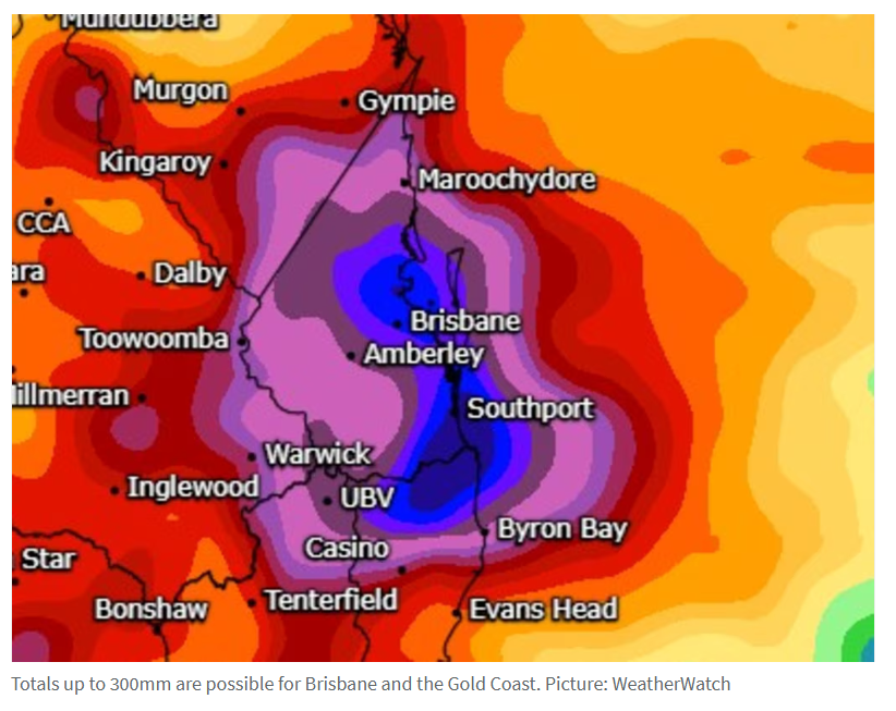 局部雨量可能更高。Sky News气象学家Rob Sharpe认为布里斯班与黄金海岸累计雨量不排除300毫米的可能。"降雨有时将导致街道与庭院出现突发洪水。值得庆幸的是,由于近期干旱,河流沿线地区所受洪水影响应有限。"Sharpe表示,此次降雨过程正值布里斯班经历干燥夏季,此前累计雨量仅130毫米,远低于夏季平均值的444毫米。