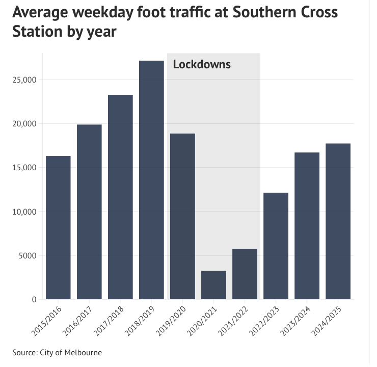 自2018—19年以来,Southern Cross Station附近的人流量下降了35%。