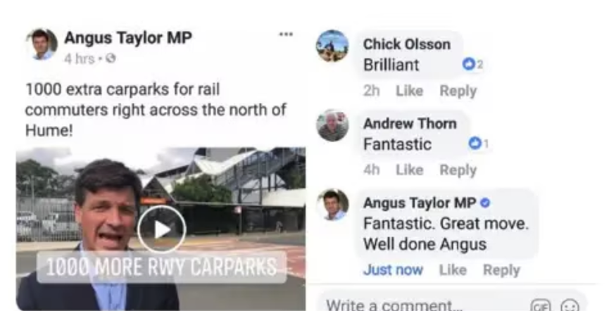 2019年5月,Taylor在Facebook发布了一段关于其Hume选区交通项目的视频,他在帖子称自己为通勤者创造了1000个额外的停车位。