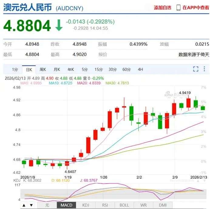 过去24小时,澳元出现短线跳水,兑人民币汇率从高点4.93,一路回落至4.88,跌幅近3%。