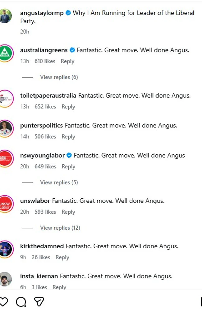 此前,Angus Taylor在社交媒体公开宣布竞选党领袖的时候,就曾引发热议。