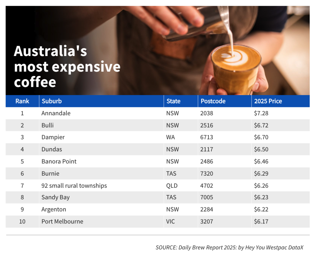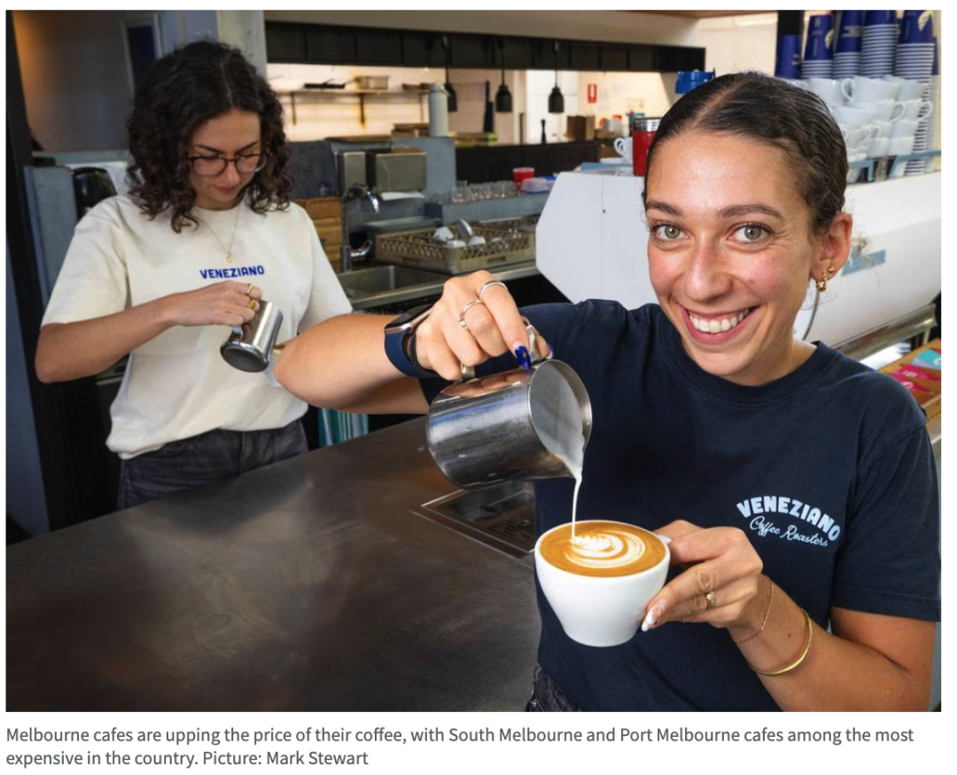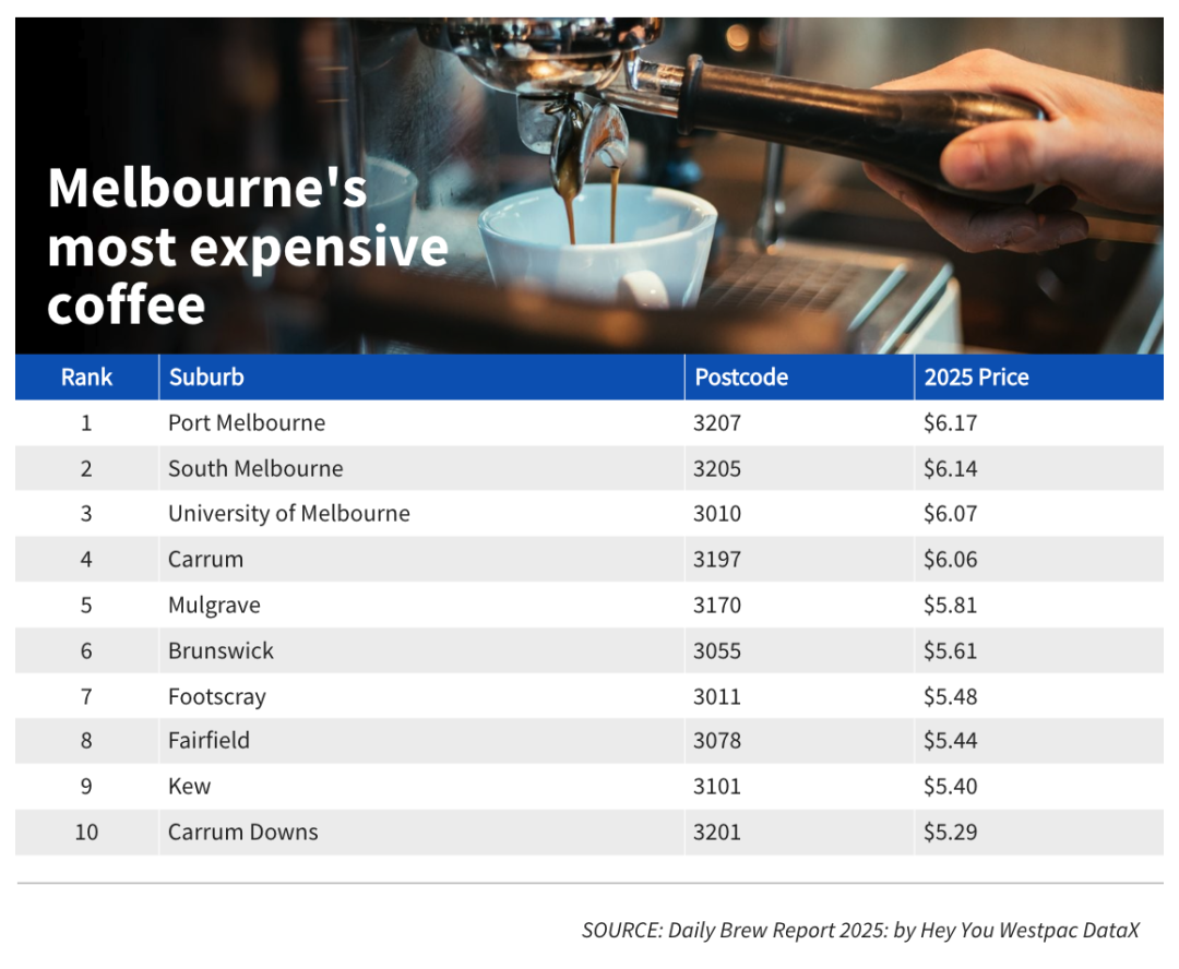 数据显示,Port Melbourne和South Melbourne是全国咖啡价格最高的郊区之一,而此次咖啡价格的大幅上涨正是基于这一数据。Hey You 的 2025 年每日咖啡报告发现,Port Melbourne, South Melbourne, the University of Melbourne, Carrum and Mulgrave 位列最贵咖啡榜单前列,平均每杯咖啡的价格超过 6 刀。