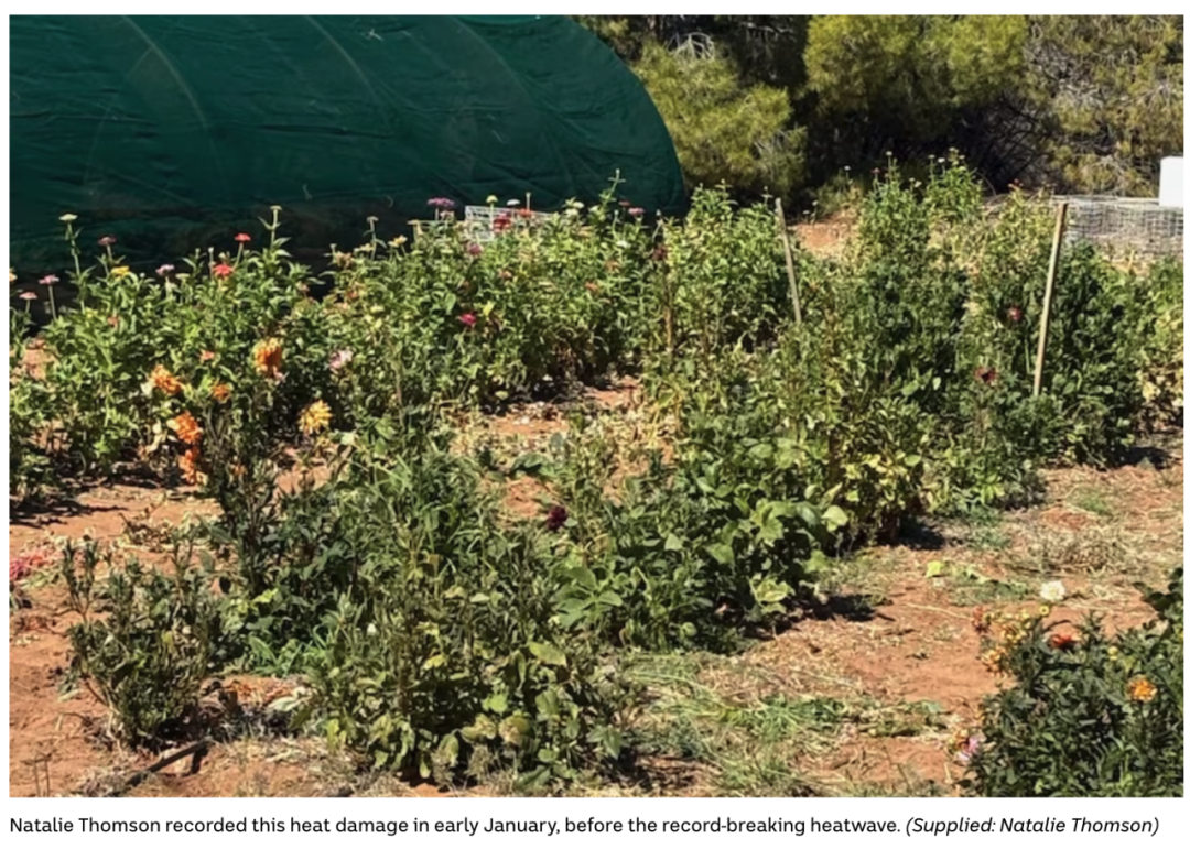 花农 Natalie Thomson 在 Nyah West 的微型花场辛辛苦苦栽培了多年,但她坦言这次极端高温(部分地区曾接近 48°C)太过猛烈,连她最耐热的百日菊、翠菊这样的品种都被烤得没了生机,只能砍掉整块作物重新开始。这意味着她今年无力提供任何鲜花用于情人节销售,生意计划彻底泡汤。