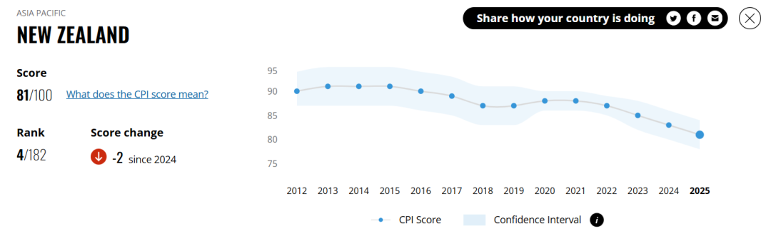 然而,在另一项国际排名——“全球最清廉国家和地区”中,新西兰排名却连续四年下降!