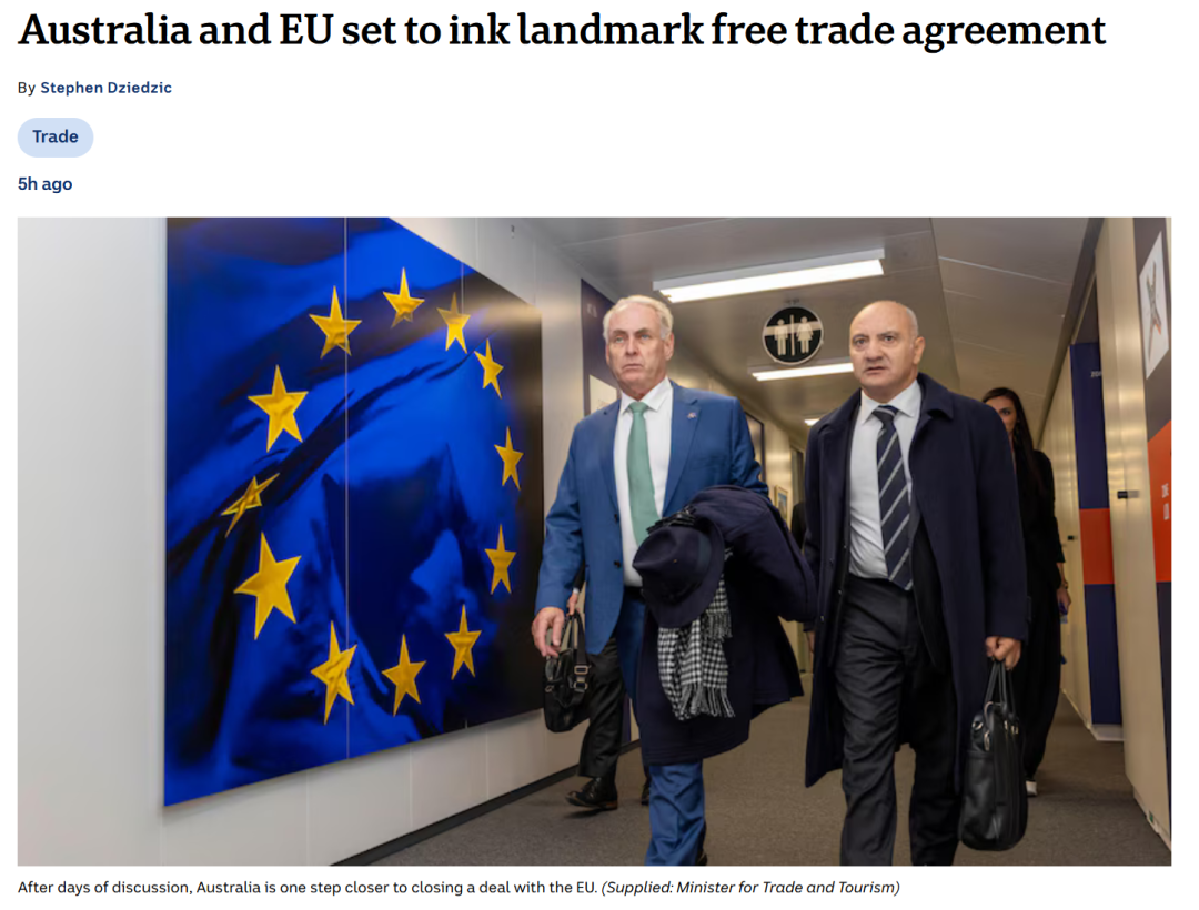 2023年时,澳方曾提及,除非欧盟同意取消对澳洲牛羊肉等大量农产品的贸易壁垒,不然不签协议。