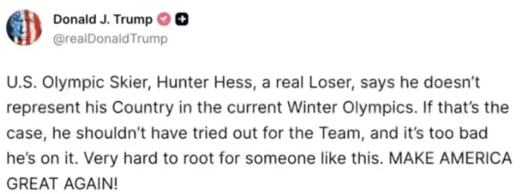 事情的起因,是美国滑雪运动员亨特·赫斯(Hunter Hess,下图)在米兰冬奥答记者问时,谈到美国国内局势、包括移民执法冲突等表示,自己对很多事情并不完全认同。