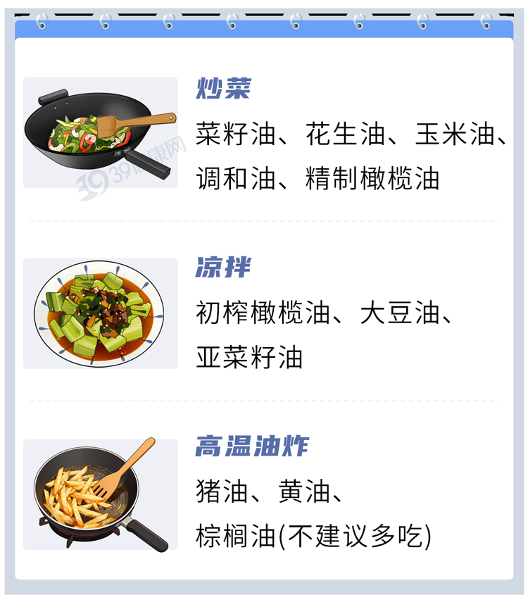 若长期食用一种油易导致人体缺乏某些脂肪酸,而不同食用油的交替使用,则可及时弥补彼此不足之处。以下是不同烹饪方式的食用油选择,可以参考一下: