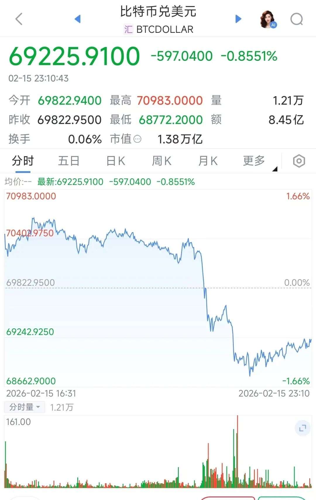 2月15日,比特币价格继续剧烈波动,今日一度触及71000美元/枚的比特币再度直线跳水,截至发稿跌至69225.91美元/枚。以太坊更是跌超3%。