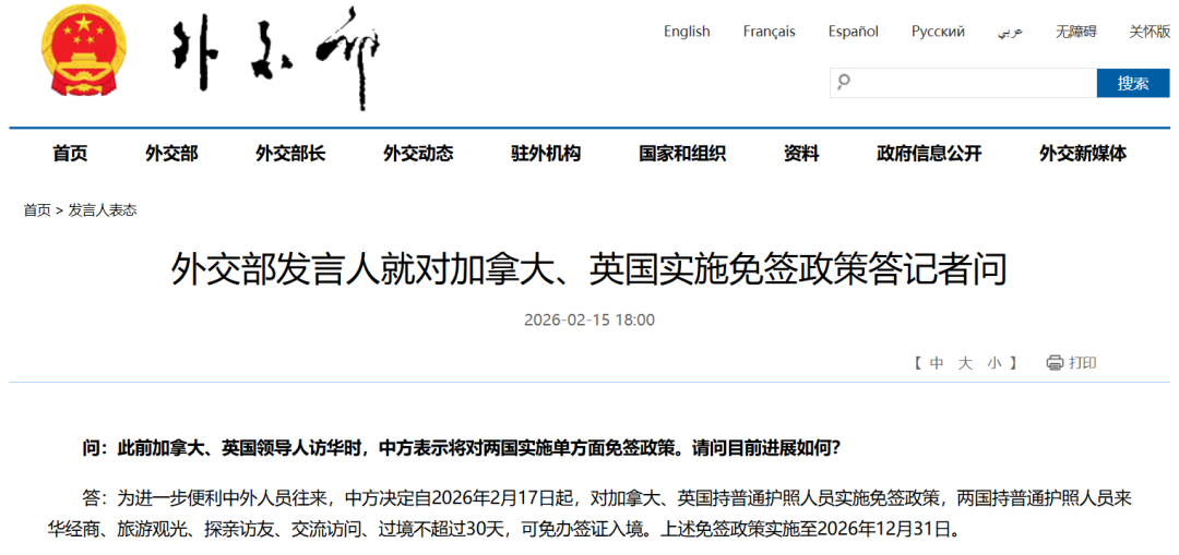 外交部发言人表示,为进一步便利中外人员往来,中方决定自2026年2月17日起,对加拿大、英国持普通护照人员实施免签政策,两国持普通护照人员来华经商、旅游观光、探亲访友、交流访问、过境不超过30天,可免办签证入境。上述免签政策实施至2026年12月31日。