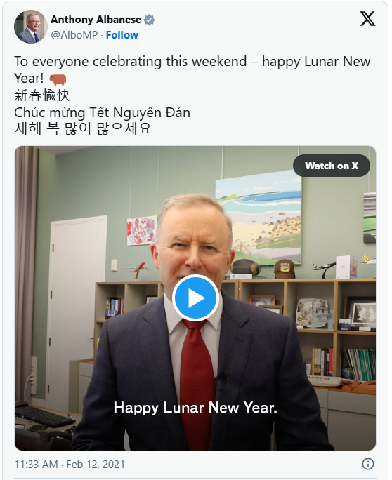 而今年,2026年的春节祝福,总理阿尔巴尼斯就从善如流的用上了Happy Chinese New Year的说法,这也正是华人社区愈发强大的体现,。
