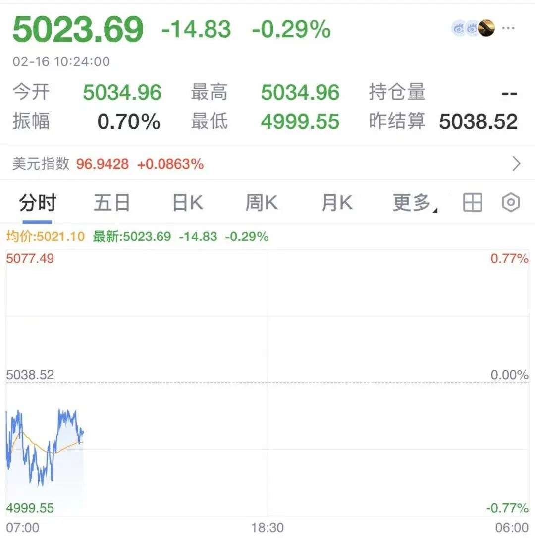 2月16日,国际金价震荡下跌,现货黄金一度跌破5000美元。截至发稿,现货黄金价格有所回升,报5023.69美元。