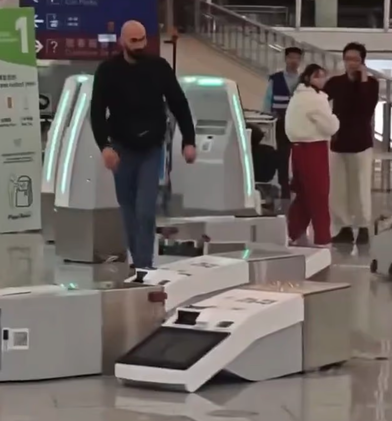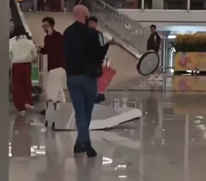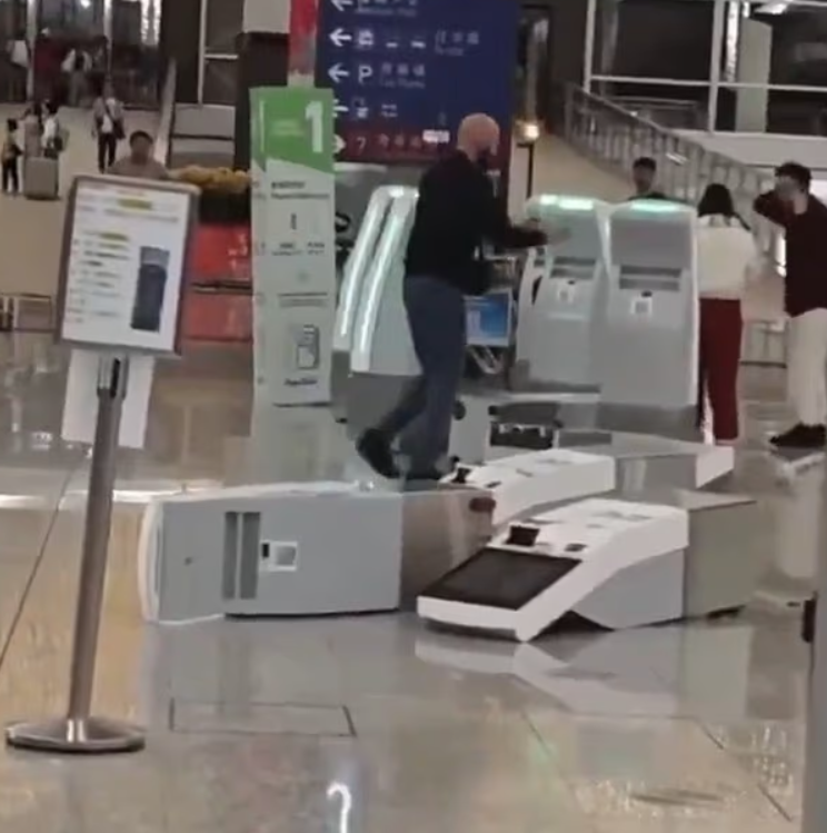 他先是把多台自助值机机推倒在地,随后情绪进一步升级: