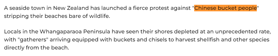 然而这件事真正让其升级的是该国部长Shane Jones 在解释禁令时的一句话。他在采访中表示,有人正在组织大巴车前往海岸采集,并形容这种现象为:“Peking duck invasion of the rock pools.”这句带有明显文化隐喻的比喻,迅速在媒体和社交平台上引发争议。