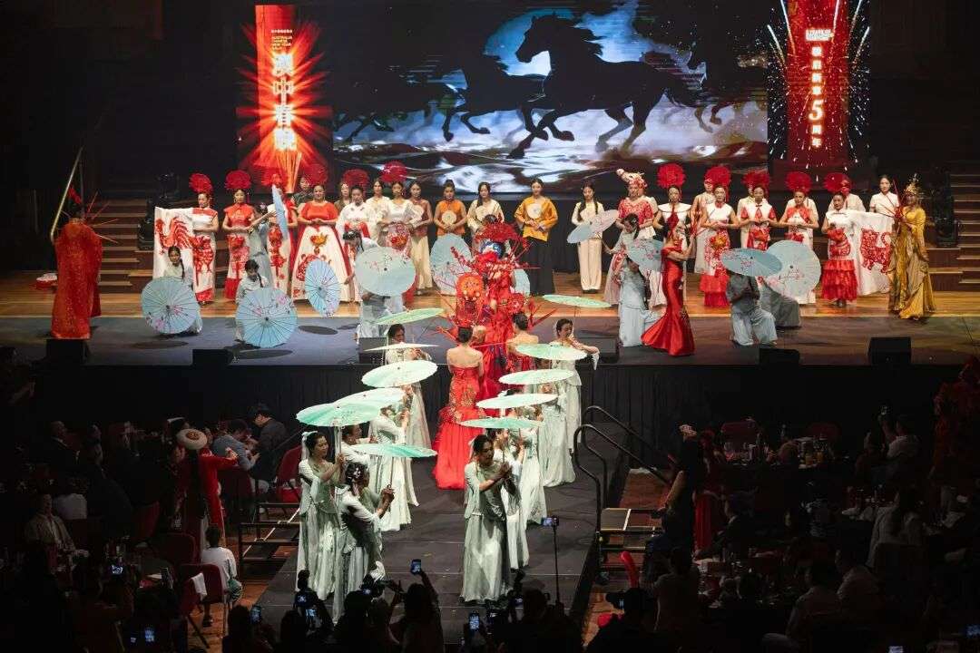 近40匹灵动可爱的小马造型亮相,呼应丙午马年新春主题,瞬间点燃全场热情。中华元素轮番绽放、相得益彰。身着中新中式服装的侨胞身姿优雅,盘扣、苏绣、水墨等中式经典元素与现代剪裁巧妙融合,尽显东方雅致与时代风采。