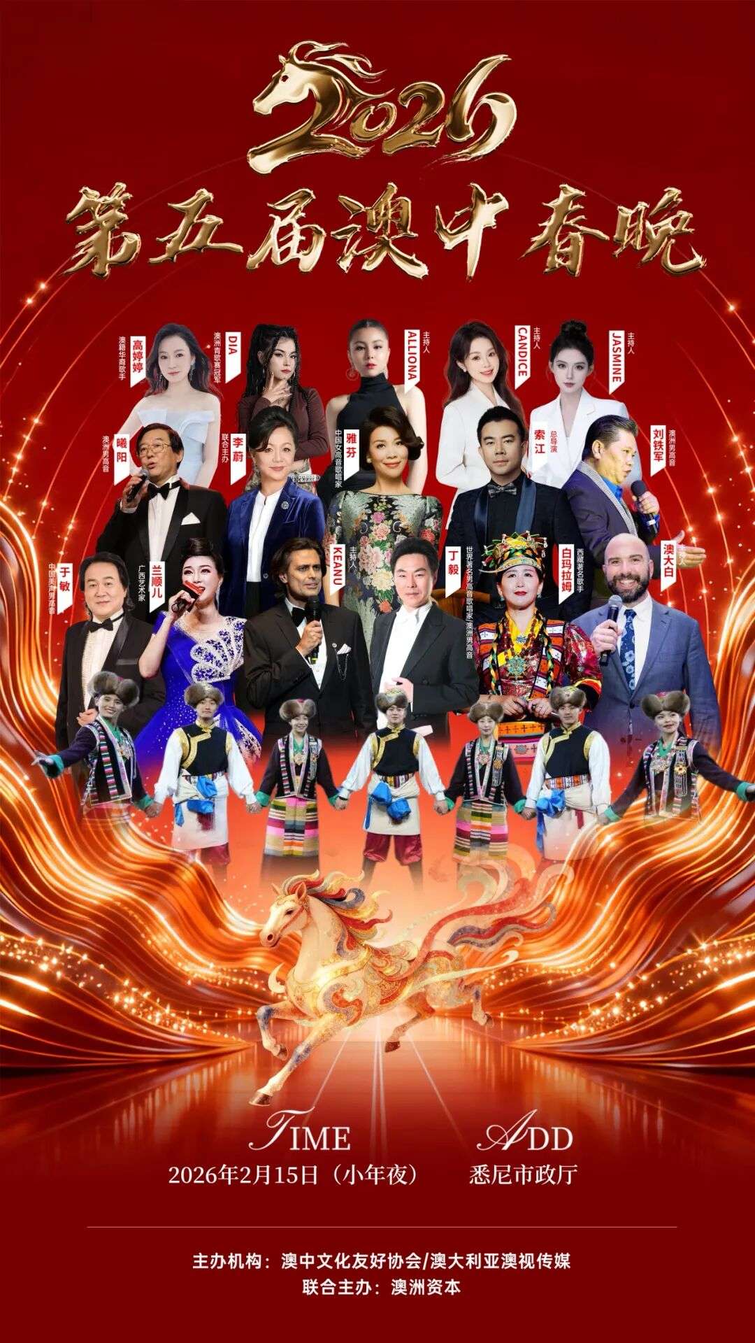 2026年2月15日小年夜晚, 备受瞩目的年度文化盛事——2026年第五届澳中春晚,在悉尼市政厅璀璨启幕。本届晚会以“骐骥逐光,中澳同春”为主题,由澳大利亚澳视传媒、澳中文化友好协会及澳洲资本联合匠心打造。
