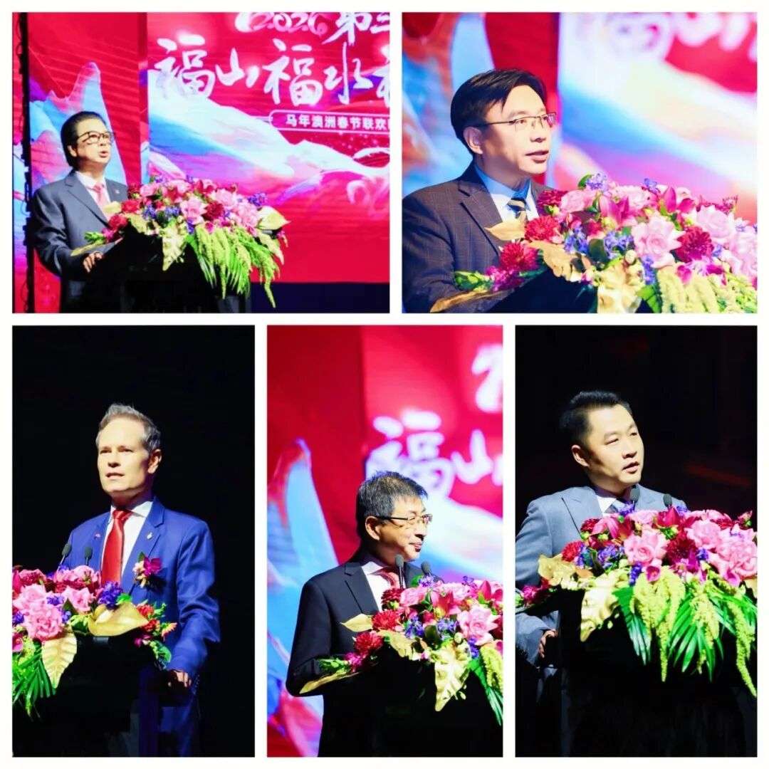 福山福水福天下春晚主办方澳中工商联合会主席苏鑫峰、中华人民共和国驻悉尼总领馆乐利文参赞、Mr Tim James MP新南威尔士州影子州长凯莉.斯洛恩MP特使、Strathfield市市长Benjamin Cai蔡定杰、Parramatta市副市长Charles Chen陈潇,在晚会开始前发表了重要讲话。