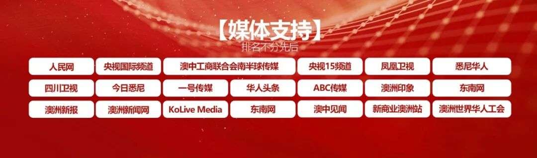 特别感谢以下媒体:央视国际频道、人民网、今日悉尼 、澳洲新、华人头条、澳中见闻、澳洲印象、ABC 传媒、澳大利亚一号传媒、澳洲工商联合会南半球传媒以及澳洲新媒体学院。