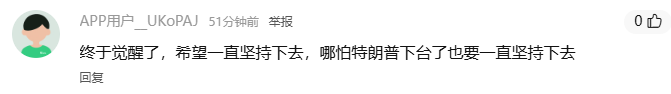 “终于觉醒了,希望一直坚持下去,哪怕特朗普下台了,也要一直坚持下去!”