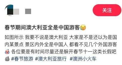 “春节期间澳大利亚全是中国游客,我要不说是澳大利亚 大家是不是还以为是国内某景点 景区内外全是中国人 都看不见几个外国游客”!