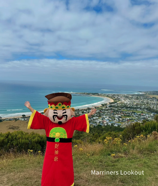 有人把小饼干举在海岸线前拍照,那画面真的很喜庆!澳洲海岸线+中国财神爷,这种组合谁能想到!
