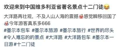 有网友发帖直接调侃:“欢迎来到中国维多利亚省著名景点十二门徒???? 大洋路再壮观,不及人山人海的震撼,感觉瞬移回国了 今年游客真系多666”!