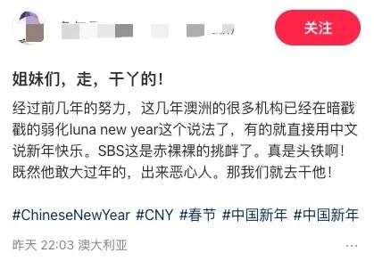 “经过前几年的努力,这几年澳洲的很多机构已经在暗戳戳的弱化luna new year这个说法了,有的就直接用中文说新年快乐。SBS这是赤裸裸的挑衅了。真是头铁啊!既然他敢大过年的,出来恶心人。那我们就去干他!”