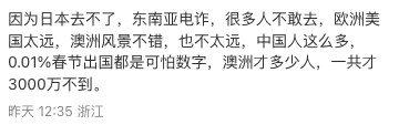 “因为日本去不了,东南亚电诈,很多人不敢去,欧洲美国太远,澳洲风景不错,也不太远,中国人这么多,0.01%春节出国都是可怕数字,澳洲才多少人,一共才3000万不到。”!