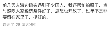 “前几天去海边确实遇到不少国人,我还帮忙拍照了,当时感叹大家经济条件好了,思想也开放了,过年不是非要留在家里了,挺好的。”