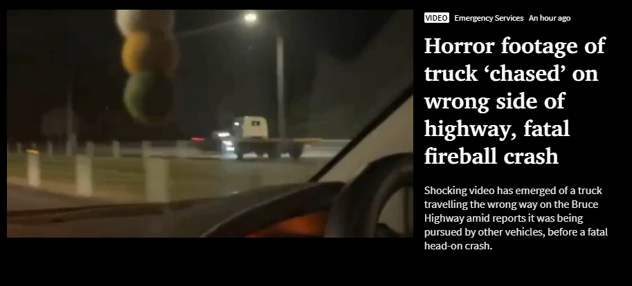 视频显示,一辆卡车在Bruce Highway上逆行,当时正有其他车辆在追逐该卡车,随后发生了致命的正面对撞事故。