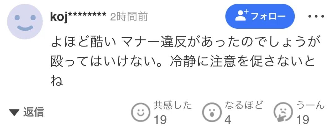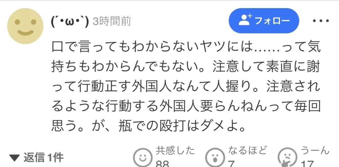 “对于那种'光说是听不懂的'家伙……这种心情也不是不能理解。被提醒后能老实道歉并改正行为的外国人,真的没几个。我每次都忍不住想,那种需要被人提醒注意行为的外国人,真希望他们别来了。不过,用啤酒瓶打人是不行的。”