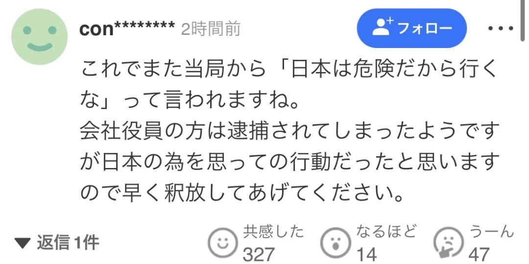“这样一来,恐怕当局又会说'日本很危险,别去了'吧。那位公司高管虽然被逮捕了,但我想他也是为了日本好才这么做的,希望早日将他释放。”