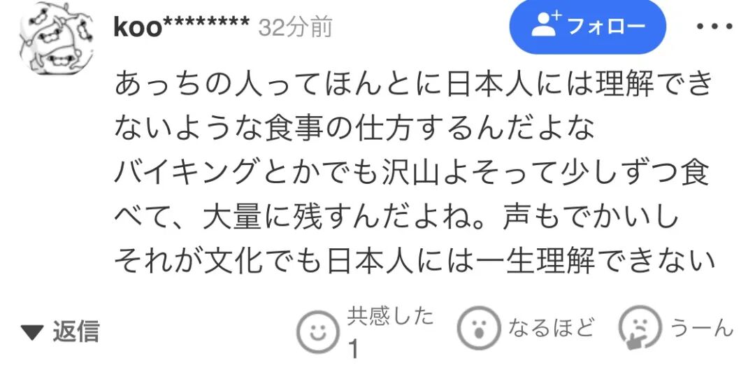 “那边的人吃饭的方式,真的是日本人理解不了的。在自助餐也是,拿一大堆,然后每样吃一点,剩下一大堆。声音还大。就算那是他们的文化,日本人也是一辈子理解不了的。”