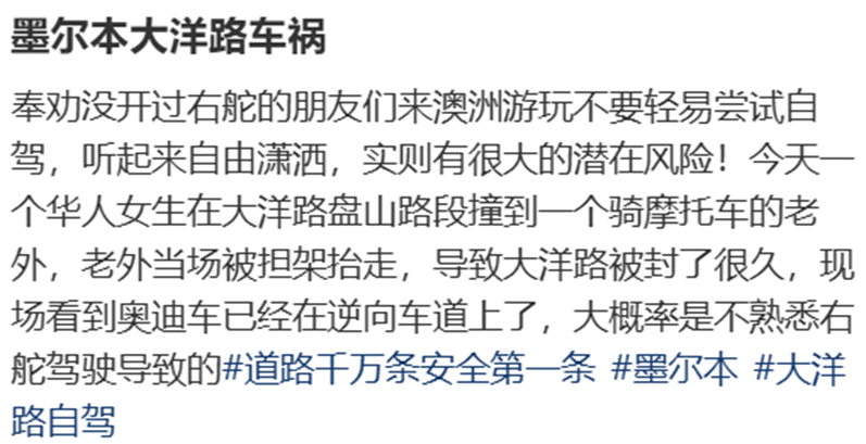 生命安全无小事,希望各位在澳洲的华人朋友们无论是日常开车还是自驾,都要谨慎驾驶。