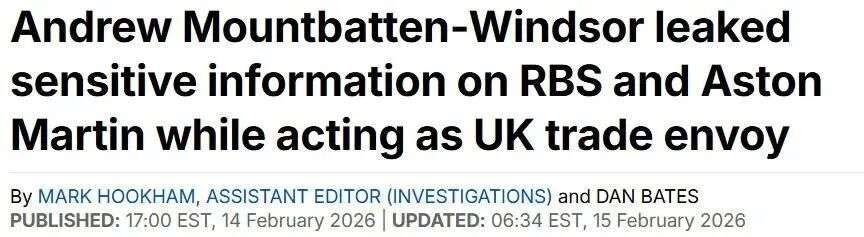 在与苏格兰皇家银行(RBS)高管会面后,安德鲁将获取的银行内部审查报告、资产出售计划等核心商业机密,通过爱泼斯坦安插在白金汉宫的“眼线”——其顾问大卫·斯特恩,悄悄泄露给了爱泼斯坦。